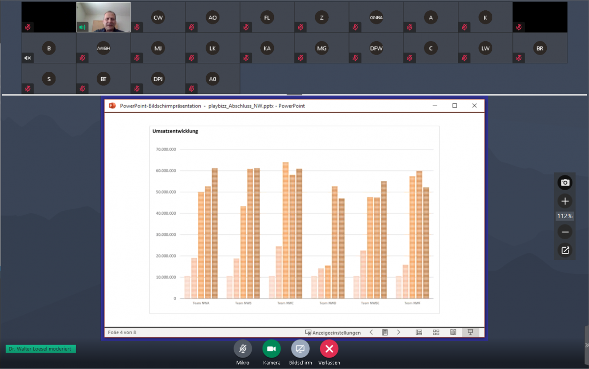Nach Auswertung der Ergebnisse durch den Spielleiter überreichte der Geschäftsführer des BWNRW, Dr. Peter Janßen, in der abschließenden Videokonferenz symbolisch den Pokal und die Preise. Den 1. Platz errangen nach einem spannenden Kopf-an-Kopf Rennen die Azubis der wissner-bosserhoff GmbH, die den neuen Wanderpokal nach Wickede geschickt bekommen. Das Siegerteam qualifizierte sich zugleich für die Bundesendrunde, die im Juni 2021 vom Bildungswerk der Bayerischen Wirtschaft ausgerichtet wird. Der zweite Platz ging an die Mannschaft der Nationalbank AG aus Essen. Den dritten Platz belegten die Azubis der Ninkaplast GmbH aus Bad Salzuflen. Dr. Janßen bedankte sich beim Verband der Metall- und Elektro-Industrie Nordrhein-Westfalen e. V. (METALL NRW) für die Übernahme der Schirmherrschaft und die Unterstützung der diesjährigen Endrunde.