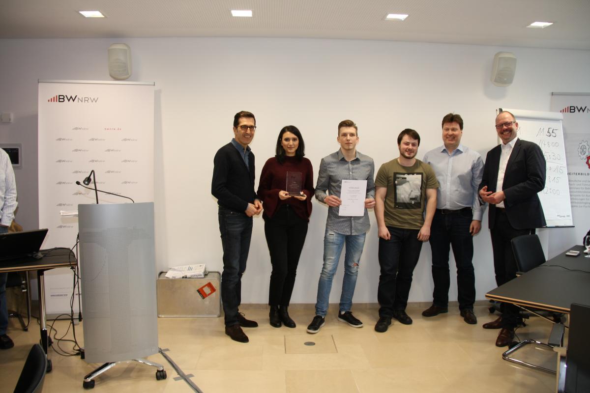 Nach Auswertung der Ergebnisse durch den Spielleiter überreichte der Geschäftsführer des BWNRW, Dr. Peter Janßen, in der abschließenden Videokonferenz symbolisch den Pokal und die Preise. Den 1. Platz errangen nach einem spannenden Kopf-an-Kopf Rennen die Azubis der wissner-bosserhoff GmbH, die den neuen Wanderpokal nach Wickede geschickt bekommen. Das Siegerteam qualifizierte sich zugleich für die Bundesendrunde, die im Juni 2021 vom Bildungswerk der Bayerischen Wirtschaft ausgerichtet wird. Der zweite Platz ging an die Mannschaft der Nationalbank AG aus Essen. Den dritten Platz belegten die Azubis der Ninkaplast GmbH aus Bad Salzuflen. Dr. Janßen bedankte sich beim Verband der Metall- und Elektro-Industrie Nordrhein-Westfalen e. V. (METALL NRW) für die Übernahme der Schirmherrschaft und die Unterstützung der diesjährigen Endrunde.